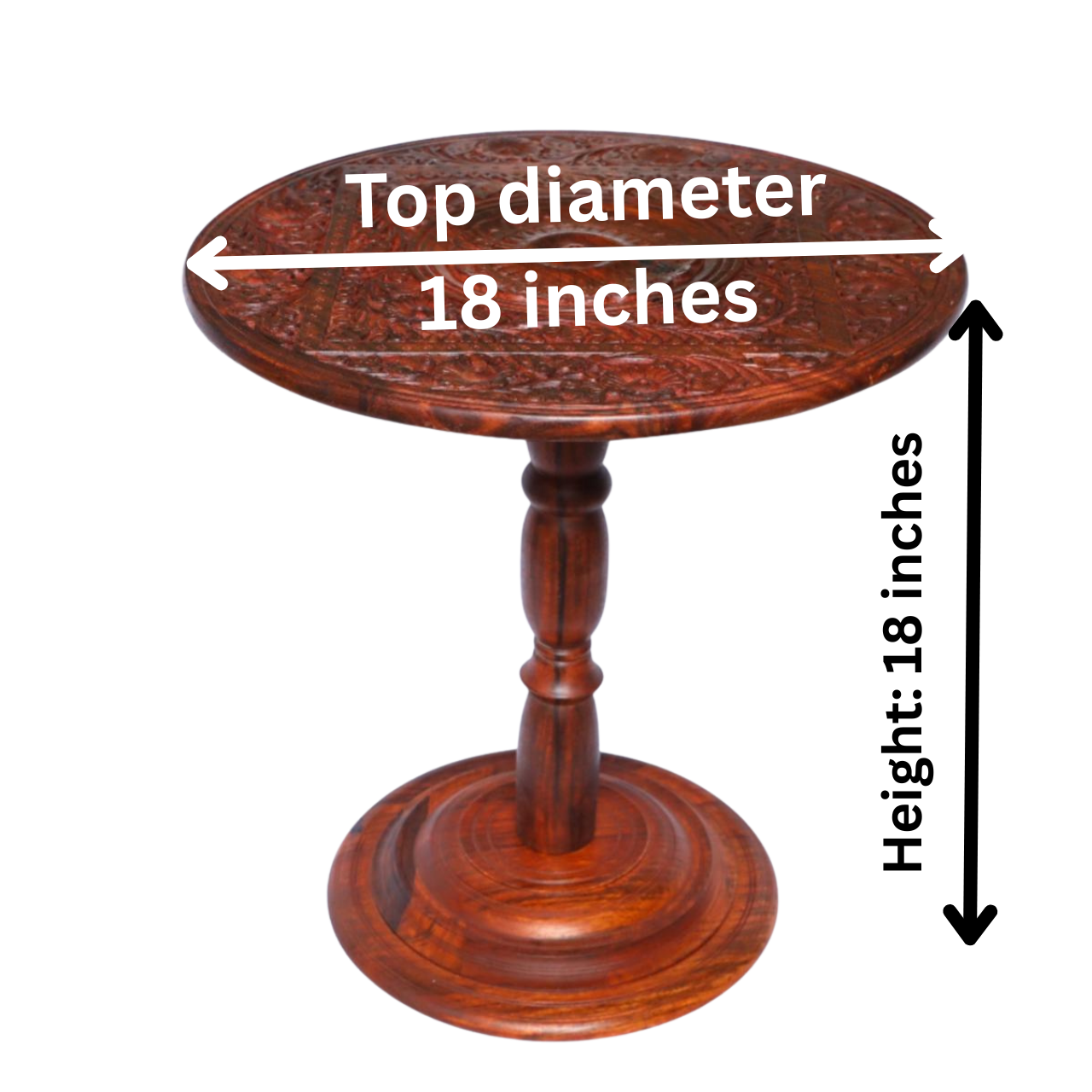 Elevate your living space with this beautifully handcrafted wooden coffee table. Featuring a rich, polished finish and an intricately hand-carved round tabletop, this table blends traditional craftsmanship with timeless elegance. The sturdy central pedestal base ensures stability while adding a classic touch. Perfect as a centerpiece for your lounge or sitting area, this piece not only serves functionality but also acts as a statement of refined taste and artistic heritage.